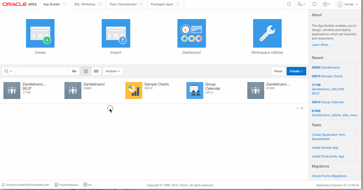 Tentokrát ukážu funkce jak dostat data z APEXu. Dříve jsem vytvořil nějaké tabulky a tak ukážu jak z nich provést export. A případně vytisknout reporty rovnou z APEXu.