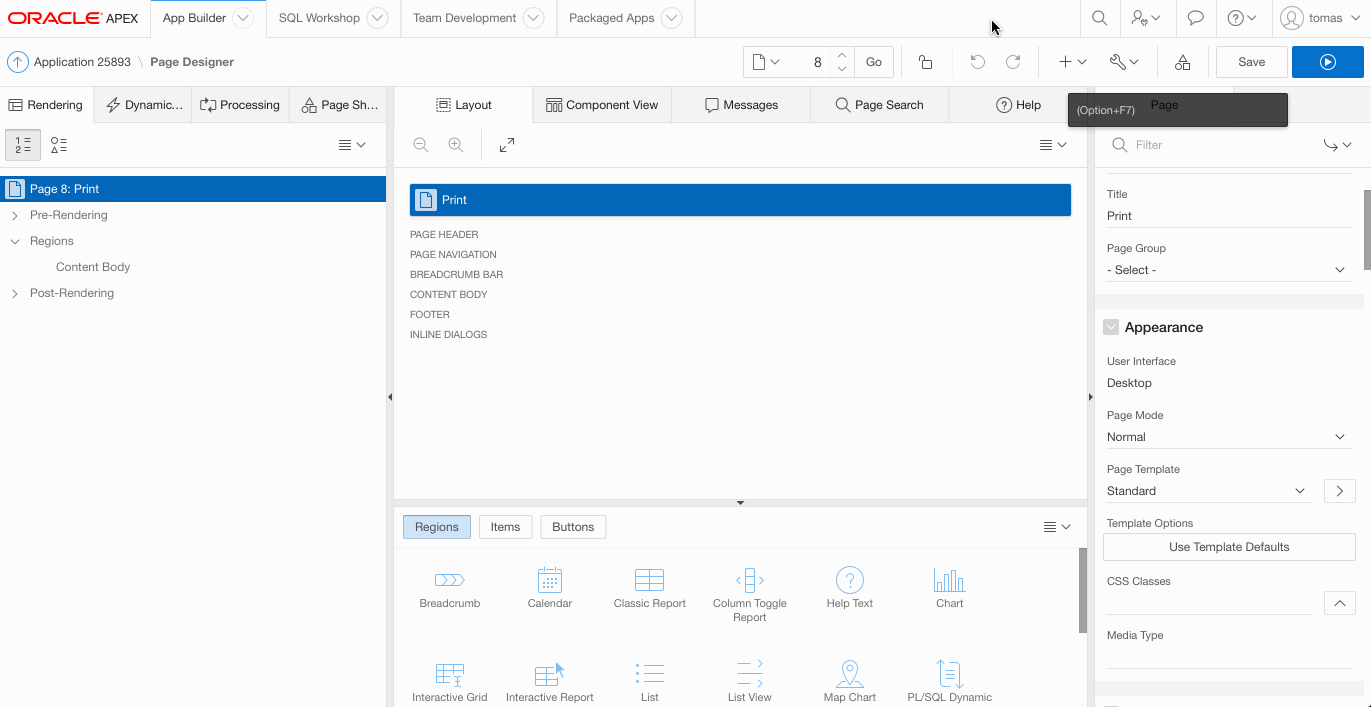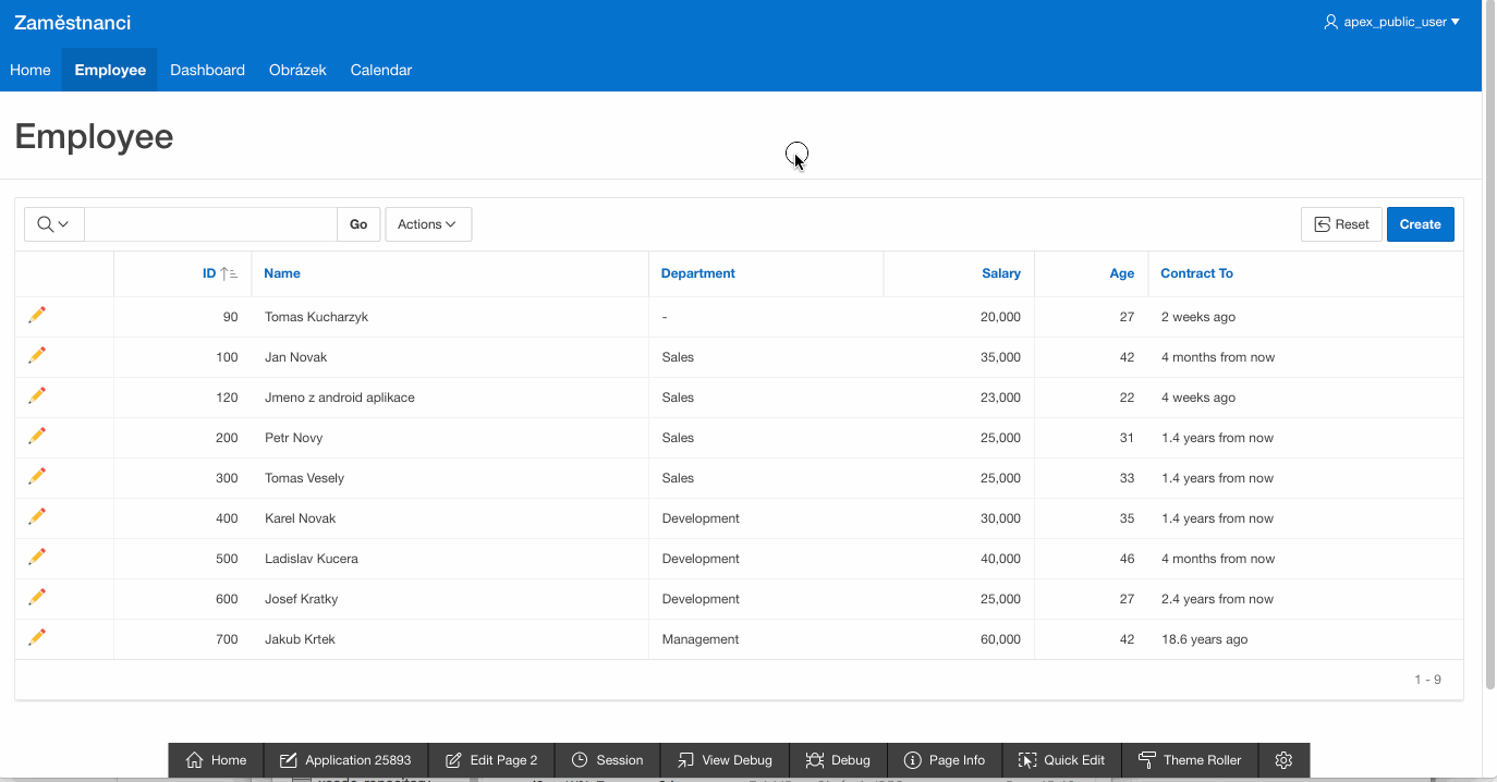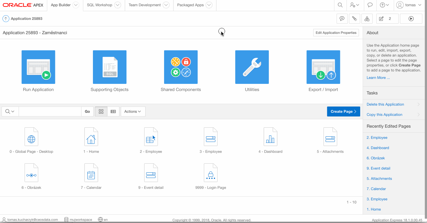 Spodní lišta s nápisem Home Application Edit page atd.. je viditelná jen pokud jsem přihlášený jako vývojář. Běžný uživatel ji dole mít nebude. Tímto způsobem jde tisknout naprosto všechny komponenty které APEX umí. Všechna pole i regiony.