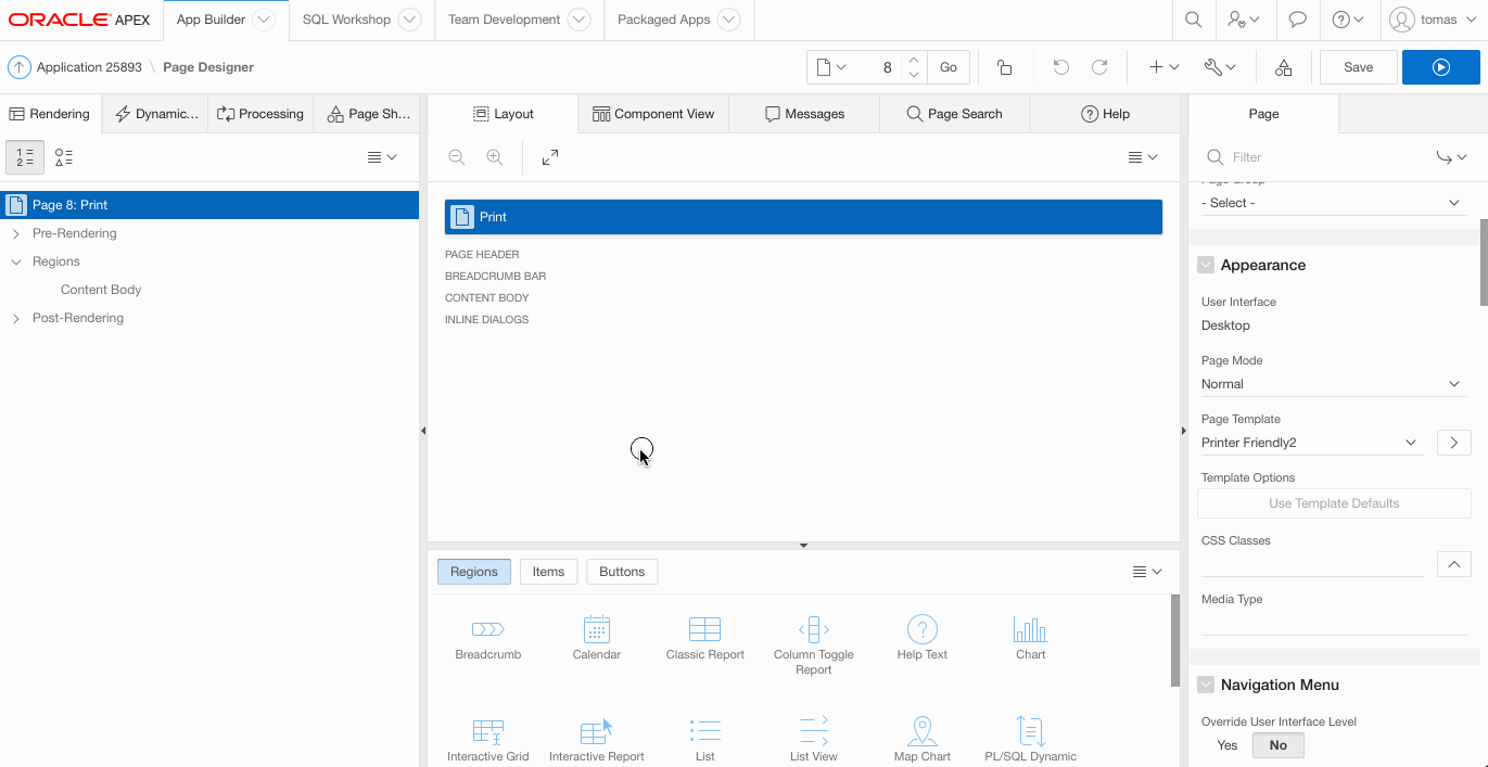 Většinou je Printer Friendly template součástí APEXu. Pokud není, musí se vytvořit. Je to docela složité ale na internetu je spousta návodů. Postup je popsaný i v dokumentaci Oracle. Pokud je template již v APEXu, stačí ho jen vybrat a strana je připravená pro tisk.