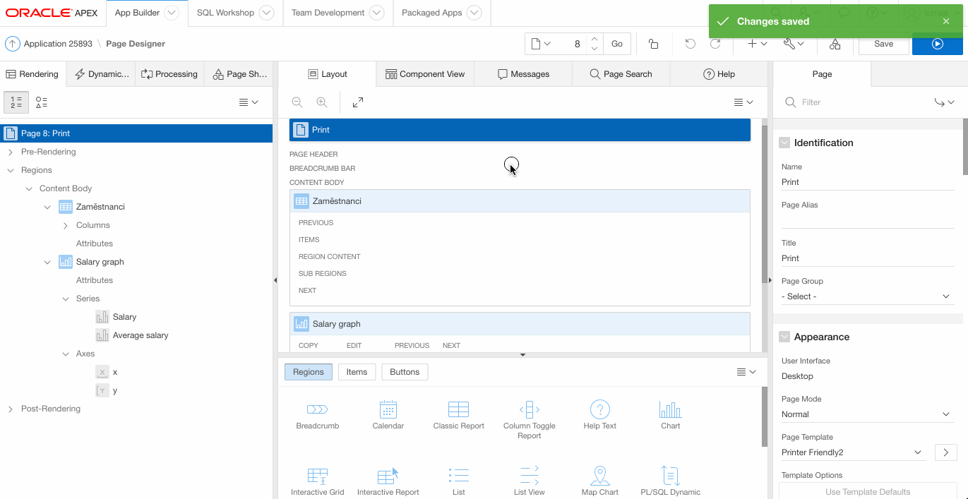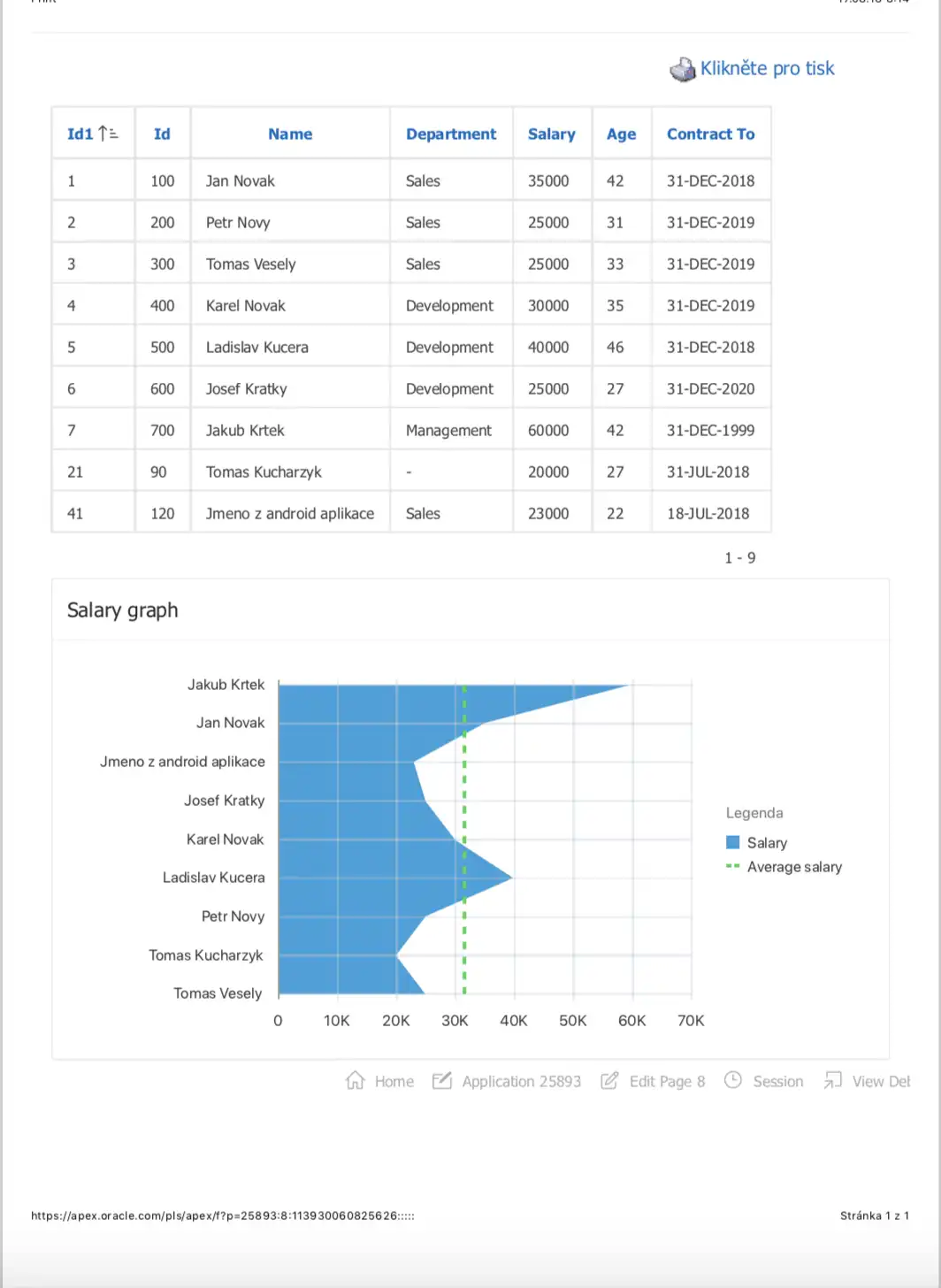 Nyní ukážu, jak vytvořit stranu, která je uzpůsobena k tisku. Umístím na ni tabulku employee a nějaký graf. Jak vytvořit graf v APEXu jsem vysvětlil v minulém článku — odkaz.
