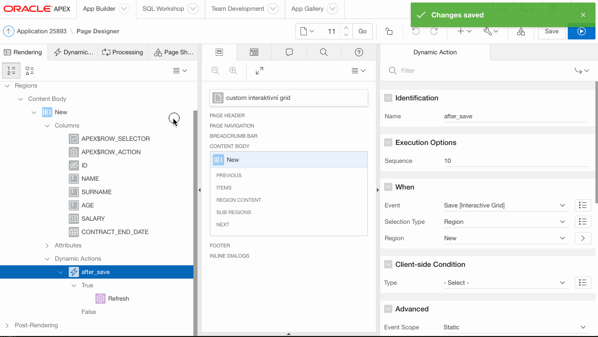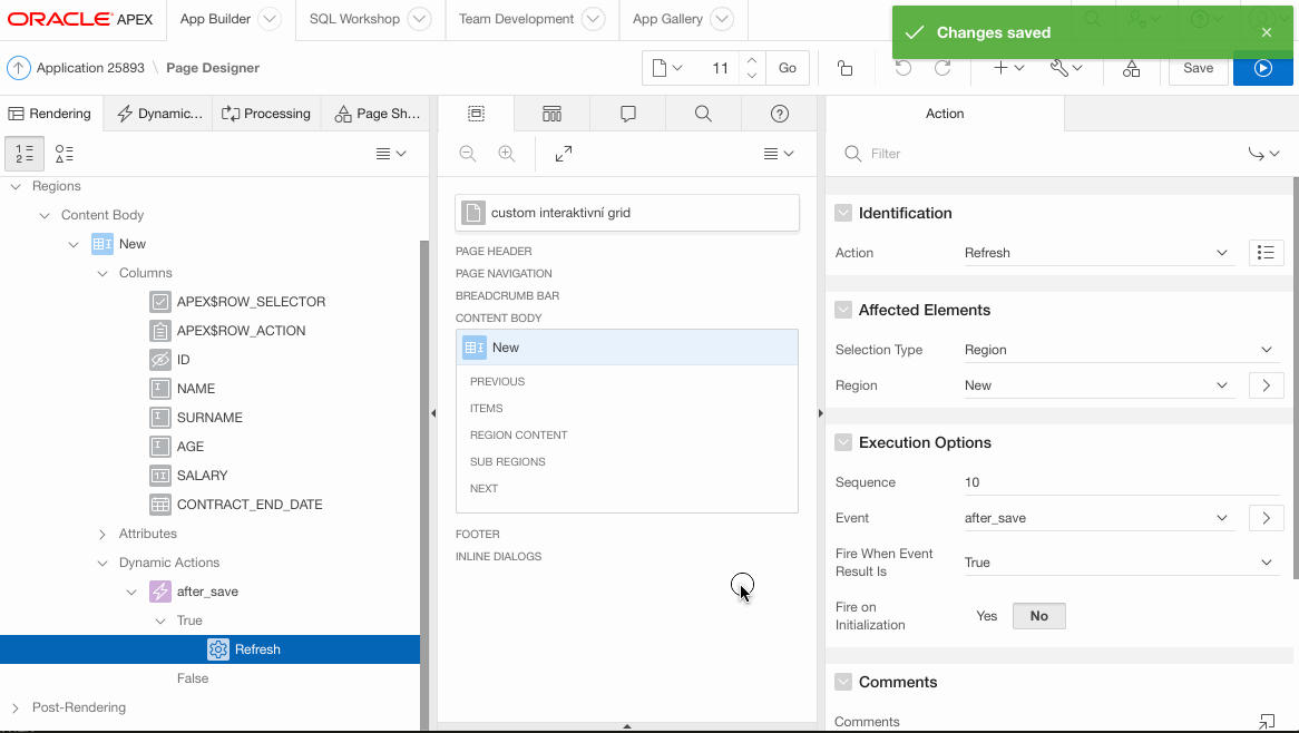 Nyní tento script zaměníme za automatický proces gridu. Sloupec ID je potřeba nastavit na typ hidden. Dále přidáte dynamickou akci na save interaktivního gridu pro refresh záznamů.