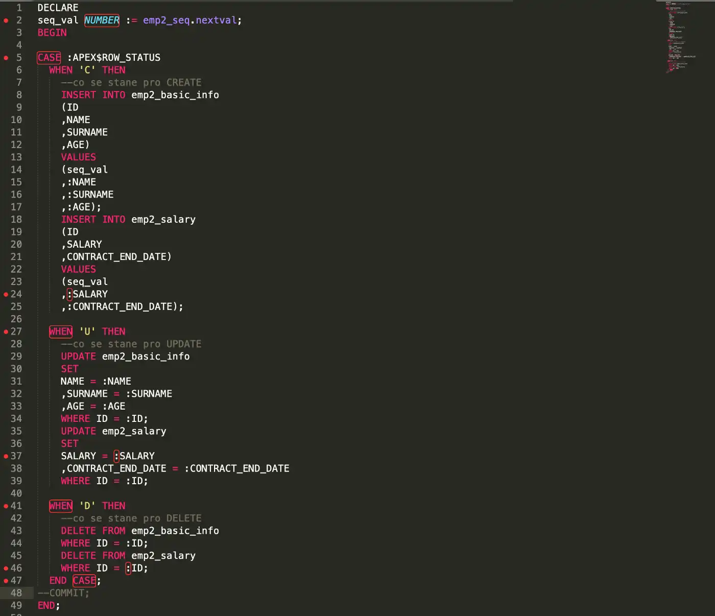 Jako příklad použiji novou tabulku se zaměstnanci, ke které připojím novou tabulku s platy. Všeobecně je jednodušší držet si tato data v jedné tabulce, ale v našem případě mám tabulku s platy odděleně, protože vývojáři do ní běžně nemají mít přístup. Personalista, oproti vývojářům, potřebuje upravovat v naší aplikaci obě tabulky zároveň. Tuhle situaci vyřešíme akcí, která zasáhne do obou tabulek.