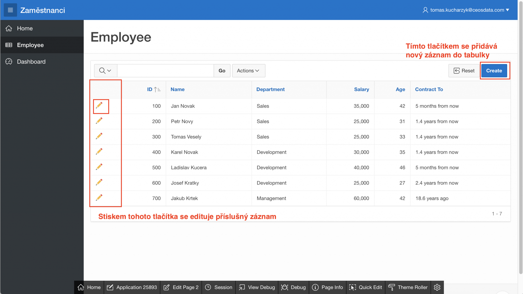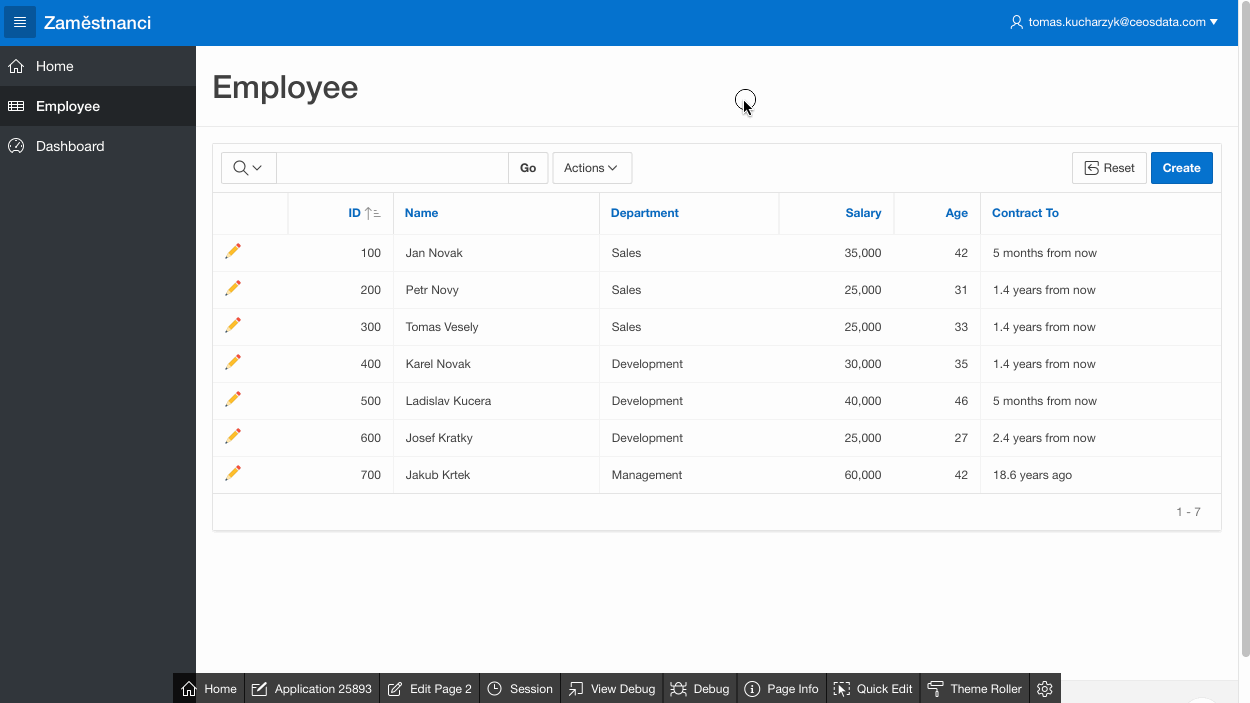 Nejprve se podíváme na záložku Employee, na možnosti editace zaměstnanců, přidání a smazání záznamů z tabulky. Na stránce vidíte jednu jednoduchou tabulku, která je tvořená komponentou interactive report. Tabulka obsahuje sloupce z původního excelu, horní menu s řádkem prvky vyhledávání a akce. Zde se dá filtrovat, sortovat, schovat sloupce, vytvářet pivot. Před každým řádkem vidíte ikonu tužky. Pomocí této ikony můžete editovat stávající záznamy. Pokud byste chtěli přidat nové, můžete tak udělat pomocí tlačítka create v pravém horním rohu.