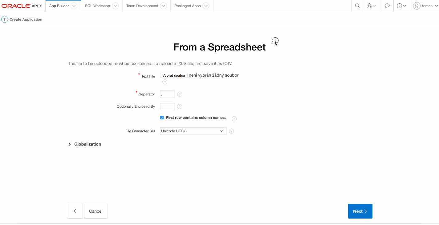 Po přihlášení do APEX workspace si založíte novou aplikaci. V našem příkladu využiju možnost vytvořit si aplikaci from a spreadsheet. Tato varianta Vám totiž umožní postavit aplikaci například z běžné tabulky vytvořené v excelu.