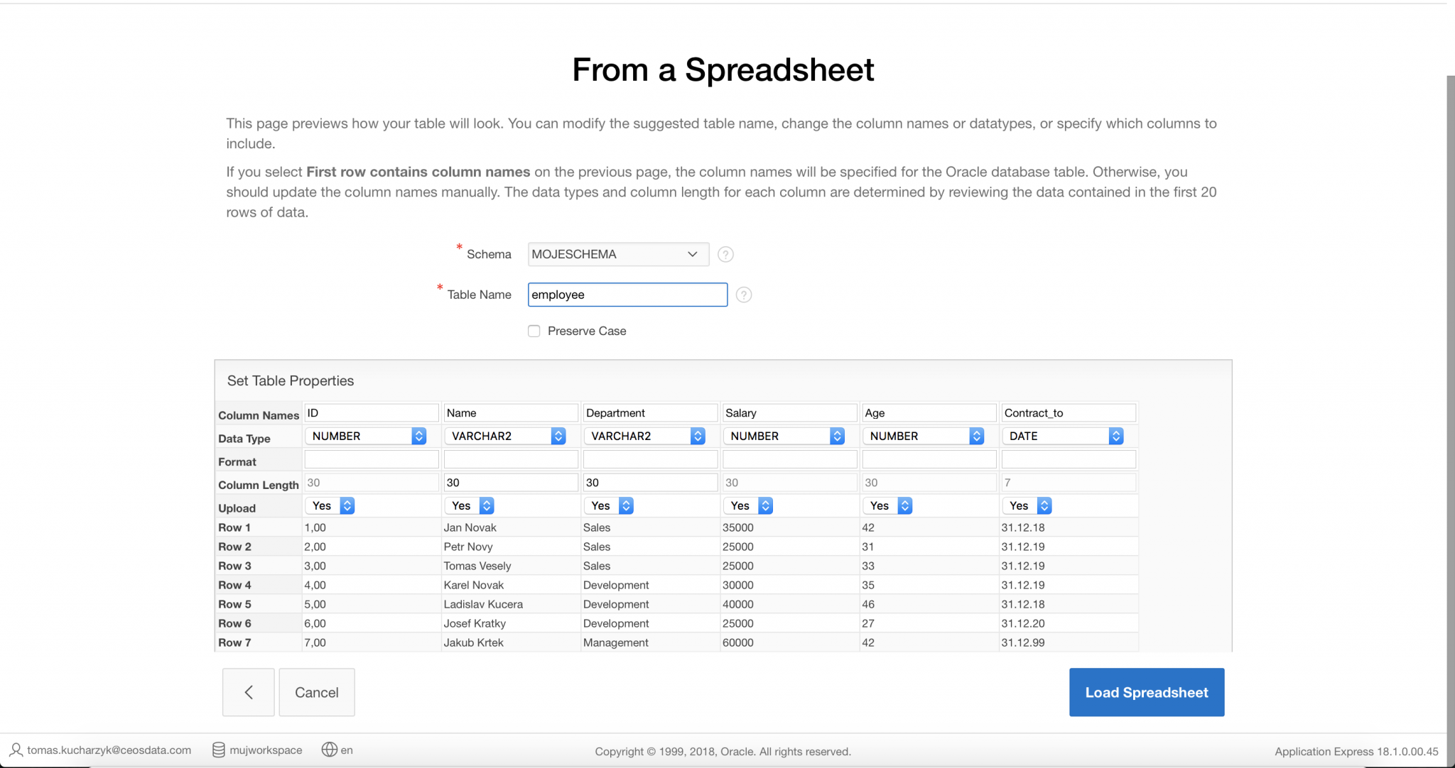 Vzorovou tabulku jsem pojmenoval Employee. V tomto kroku je velmi důležité zkontrolovat, jestli jsou sloupce ve správném formátu. Pokud nastavíte sloupce v excelu, obvykle se správně nastaví i zde. Datum musí být nastaveno na DATE, čísla na NUMBER a obecné na VARCHAR2. U Varcharu doporučuji zkontrolovat i column length, v mém případě mám nastaveno na 30 znaků, a to mi bude stačit. Pokud máte vše zkontrolované a jste spokojeni se svojí tabulkou, pokračujete kliknutím na load spreadsheet a potom na následující obrazovce tlačítkem continue to create application wizard.