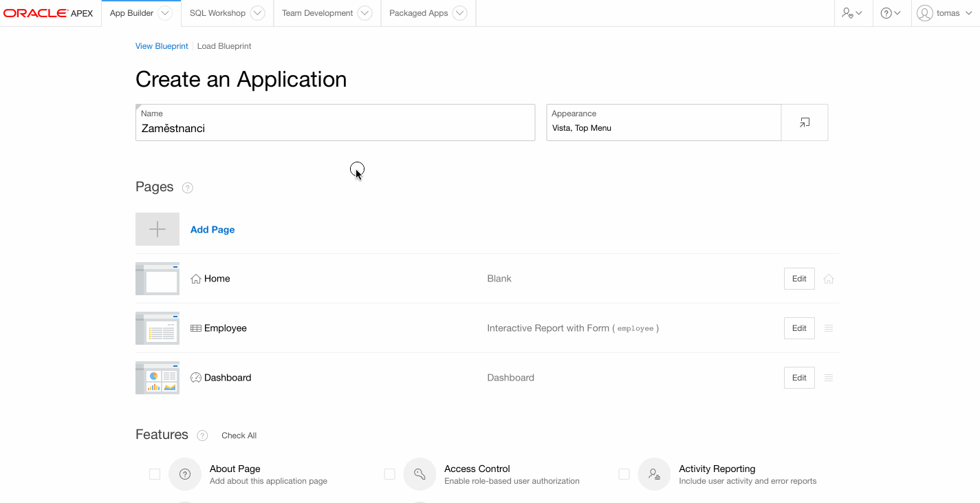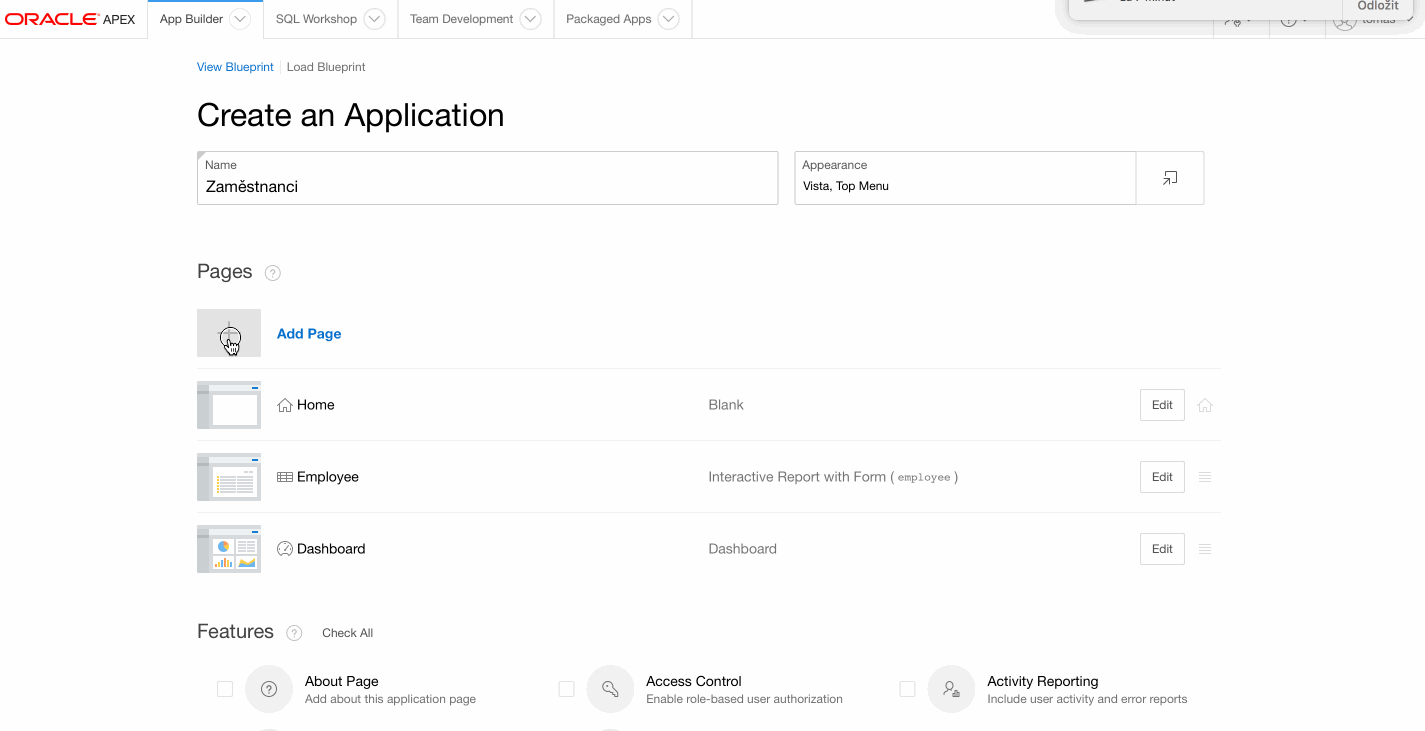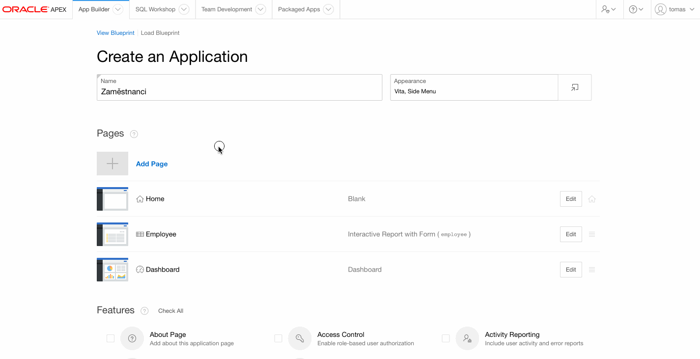 Tvorba aplikace je již hotová, teď stačí ji jen spustit a vyzkoušet, co všechno umí. Po kliknutí na aplikaci se dostanete do jejího menu, zde opět jeden klik na run application. Otevře se Vám nová záložka nebo okno, kde aplikace bude chtít abyste se přihlásili. Použijte stejné přihlašovací údaje jako pro přístup do účtu Oracle APEX.