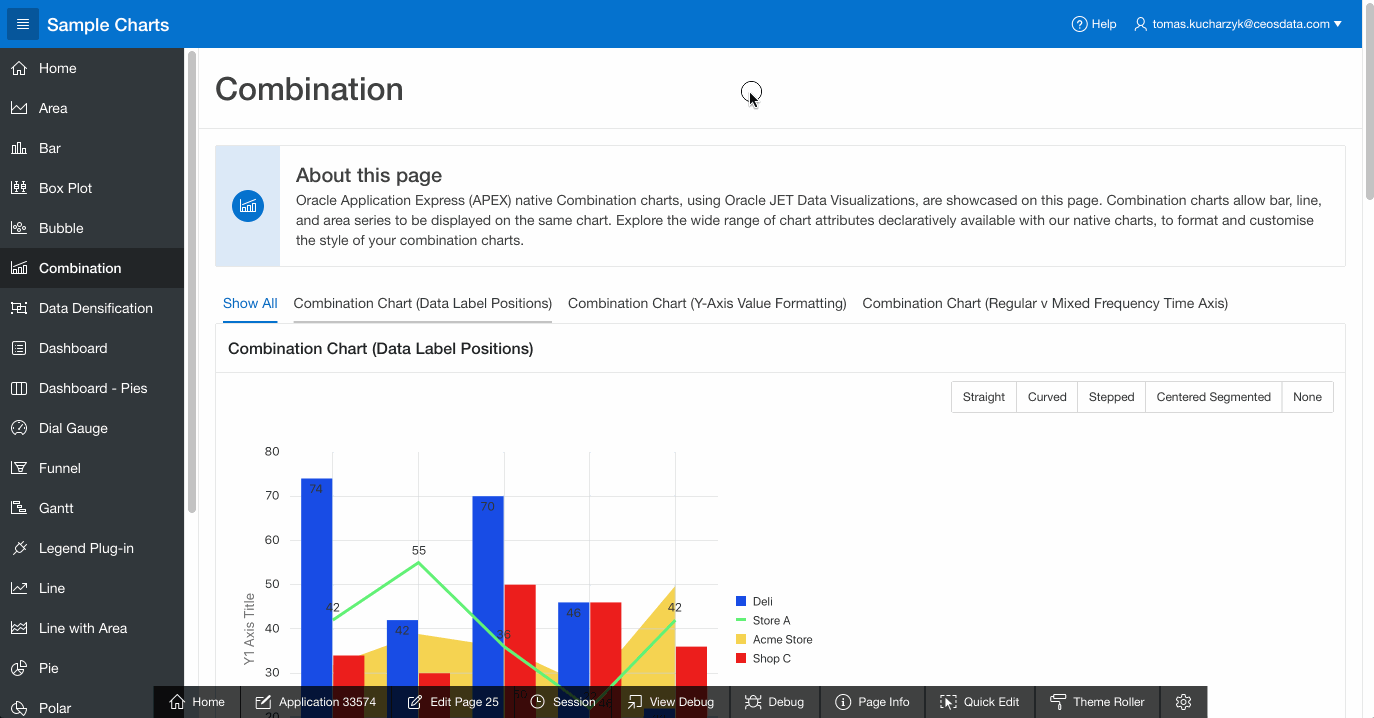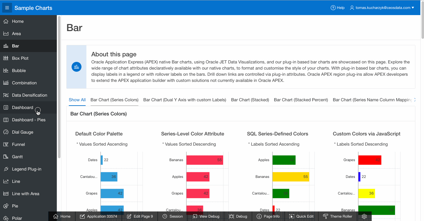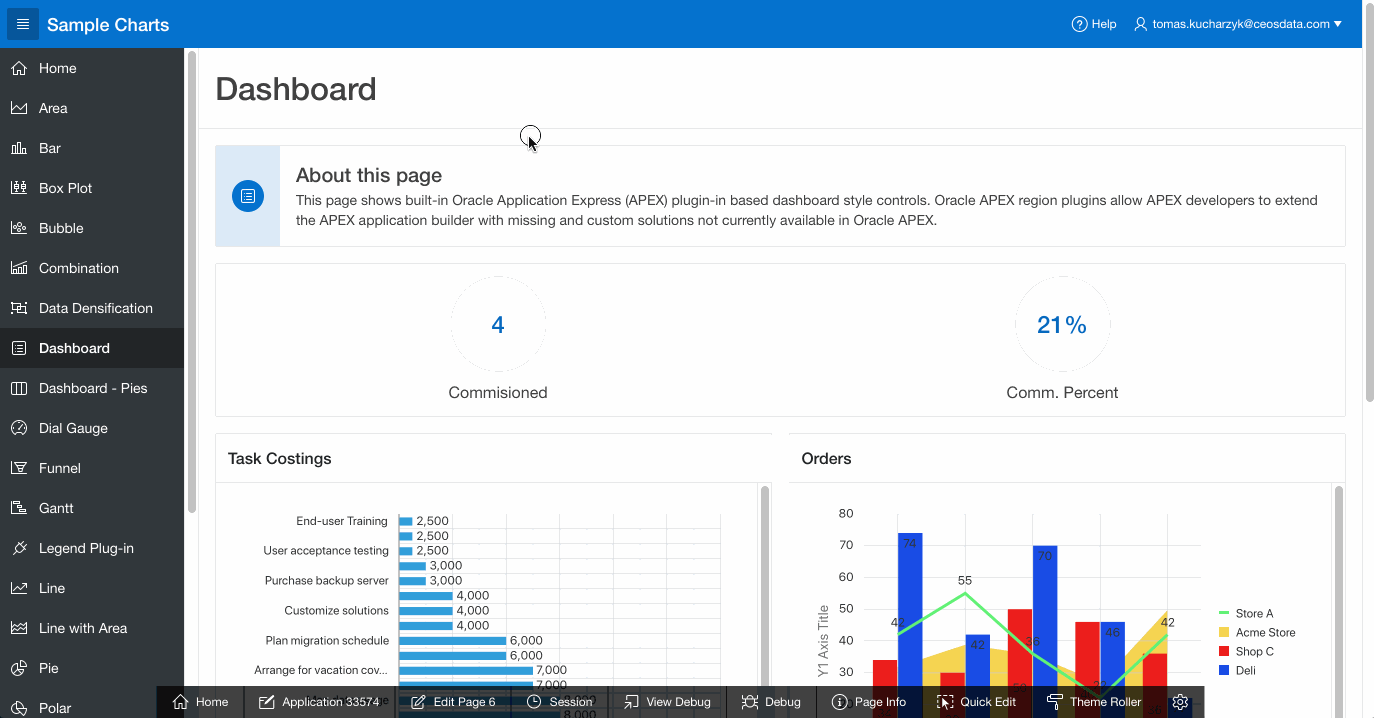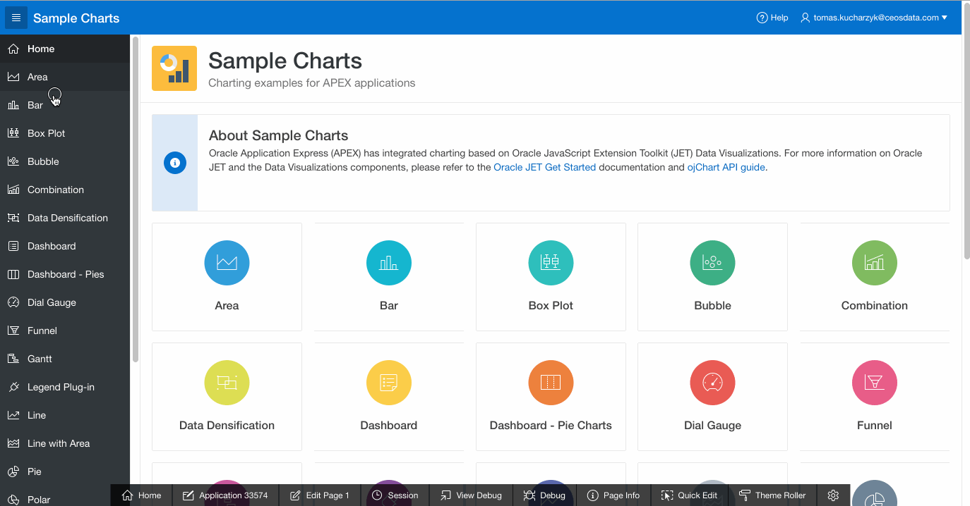 V každém workspace na apex.oracle.com jde nainstalovat takzvané “Packaged applications”. Jde o aplikace vytvořené Oraclem, které ukazují možnosti APEX prostředí a všechny jeho prvky. Dnes proto sáhnu do těchto aplikací a ukážu co všechno obsahuje ta s názvem Sample charts.