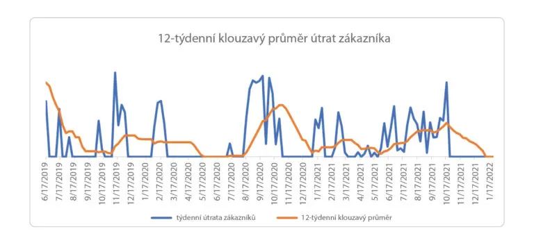 Krok 6: Když klouzavý průměr klesne pod opožděný minimální práh, je zákazník identifikován jako odcházející.