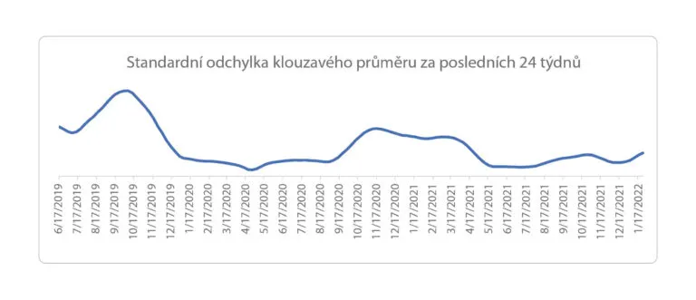 Krok 3: Vypočítejte odchylku klouzavého průměru za posledních 24 týdnů. Vzhledem k tomu, že 24 týdnů je přibližně 6 měsíců nákupního cyklu zákazníka, bylo by to adekvátní období k identifikaci jakýchkoliv výkyvů od běžného vzorce. Delší období by znamenalo nebrat v úvahu přirozené změny ve výdajích zákazníka.
