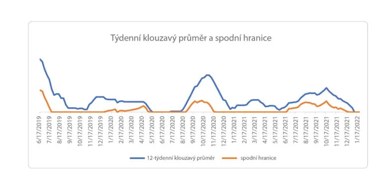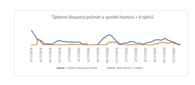 Krok 4: Definujte minimální práh. Toho dosáhnete odečtením standardní odchylky od klouzavého průměru podle následujícího vzorce: 12 týdenní klouzavý průměr – (24 týdenní standardní odchylka.