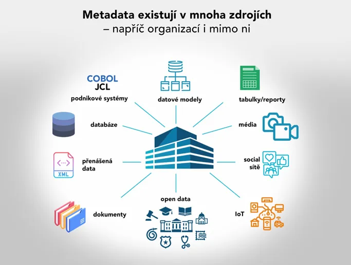 Co jsou metadata: Metadata jsou data, která vznikají při provozu podnikových systémů, aplikací a databází. Jsou to data o datech, která popisují, co se s daty v daném systému děje, jak jsou zpracovávána, ukládána, jak interagují s jinými daty apod.