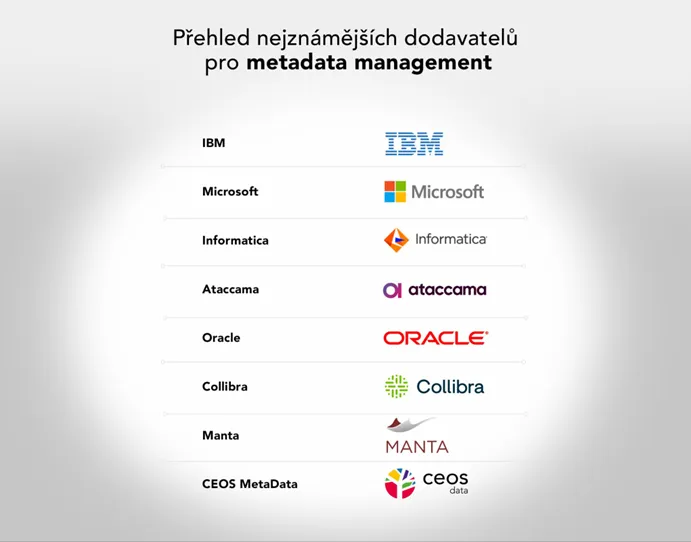 Nástroje pro správu metadat dnes nabízí velké technologické společnosti, jako je Oracle a IBM, které řeší problematiku správy metadat v celé šíři, tak i řádově menší, relativně nové, společnosti (např. Collibra), které se zaměřují na flexibilitu a jednoduchost řešení, popř. specifickou funkcionalitu (např. Manta).
