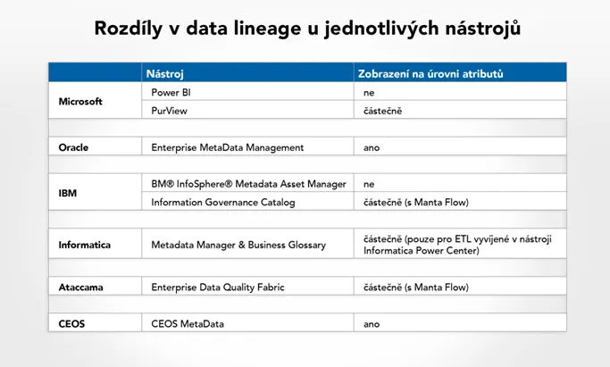 Rozdíly v data lineage u jednotlivých nástrojů