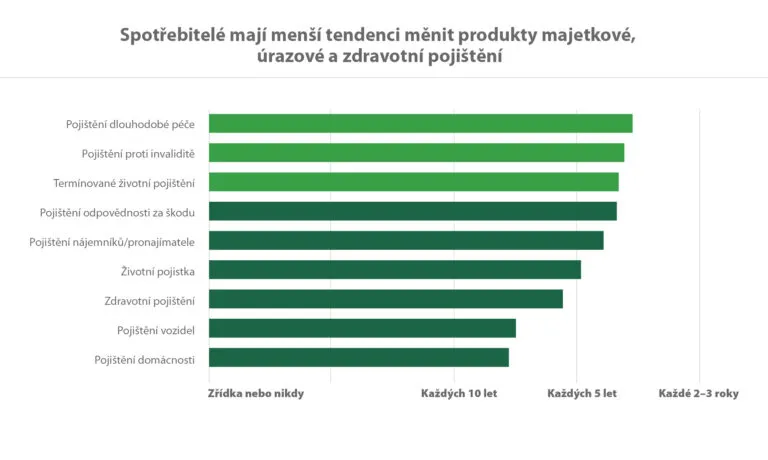 Spotřebitelé mají tendenci měnit poskytovatele pojištění pouze přibližně jednou za 10 let pro produkty v sektoru majetku a úrazů, včetně pojištění domácnosti, auta a zdravotního pojištění. Volatilita je mnohem vyšší u pojištění pronajímatele a termínovaného životního pojištění, kde mají spotřebitelé tendenci měnit zhruba jednou za pět let.